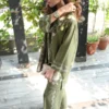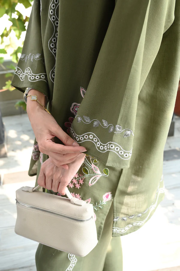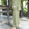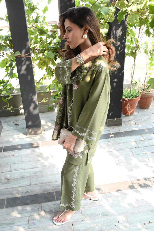 Features an olive green co-ord set enhanced with pastel floral embroidery on the front and sleeves, styled with a V neckline and paired with matching trousers finished with embroidered detailing on the hem.