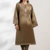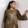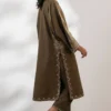 OLVIA — rendered in deep olive, this quietly striking ensemble exudes grounded elegance. Ivory threadwork blooms organically along the neckline and hem, adding delicate, artisanal contrast to the textured jacquard. Relaxed sleeves lend effortless fluidity, completing a composed, winter-ready silhouette.