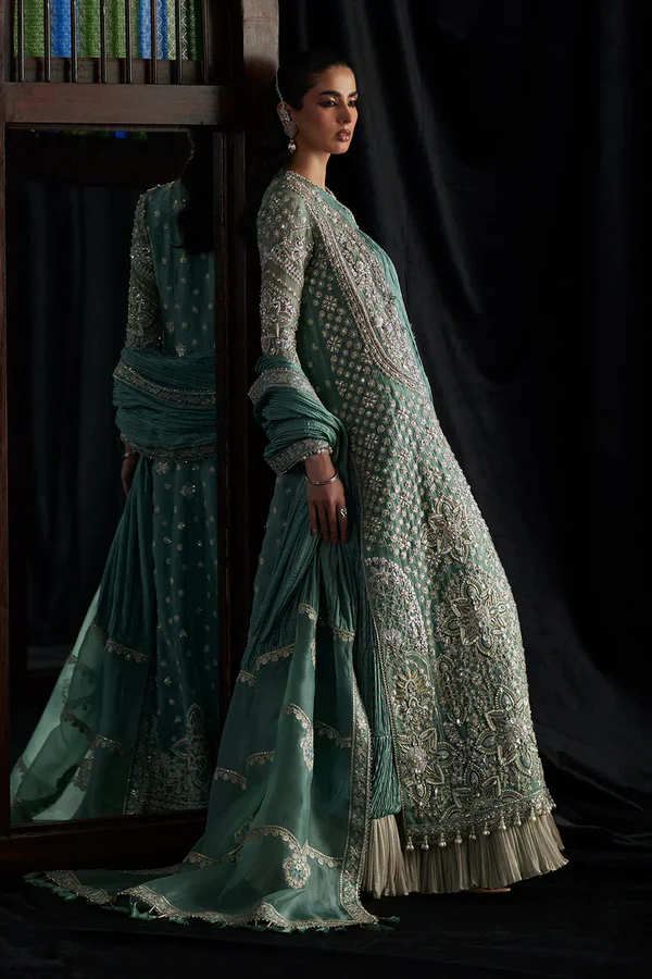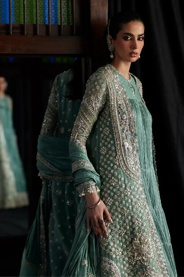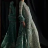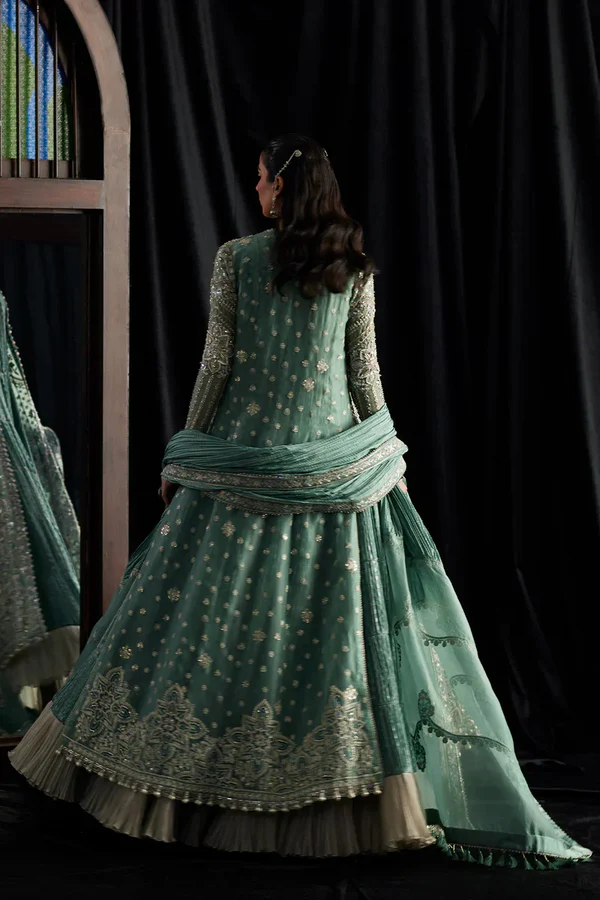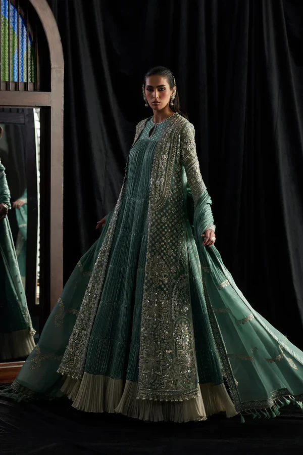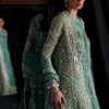 Elevate your wardrobe with this stunning turquoise open-style gown, featuring a delicate crushed inner pishwas. This exquisite piece boasts beautiful embroidery and intricate handwork that adds a touch of elegance. Paired with a gorgeous dupatta, this gown is perfect for special occasions, ensuring you stand out in style.