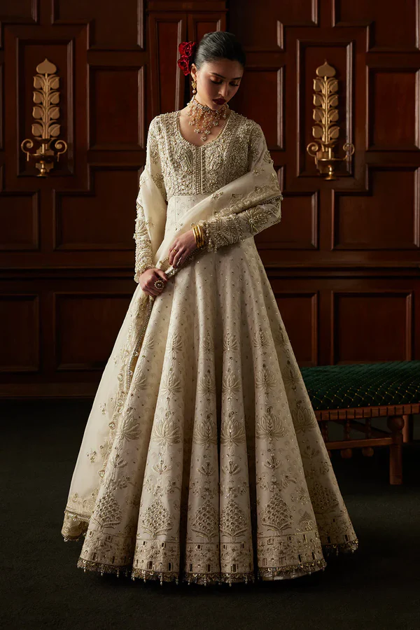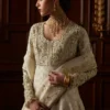 Introducing an exquisite Off-White Pishwas adorned with delicate self-on-self Resham embroidery. This dress features intricate handwork detailing on the body and sleeves, exuding a sense of royal sophistication. It is beautifully paired with an embroidered dupatta, creating a stunning ensemble perfect for any elegant occasion.