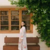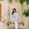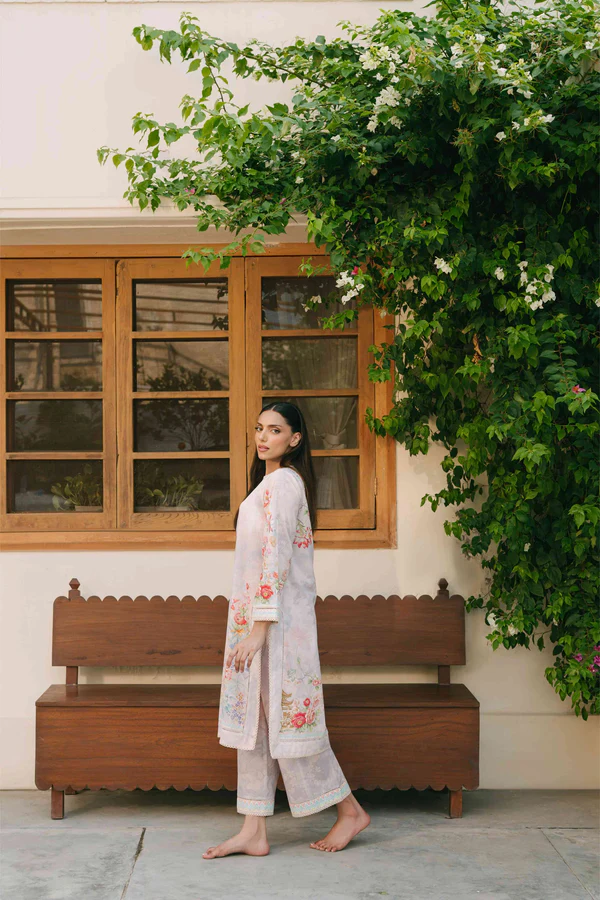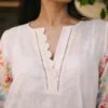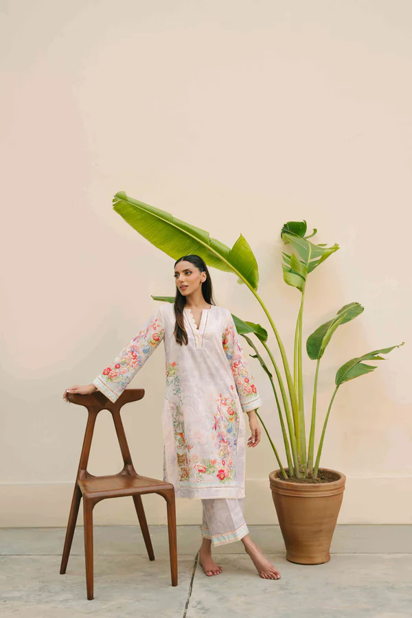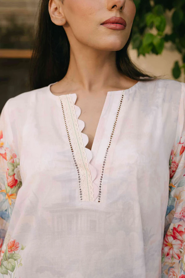 A soft neutral base delicately adorned with vibrant floral print for a fresh, romantic appeal. The airy silhouette and intricate lace detailing create a look that feels effortlessly elegant.