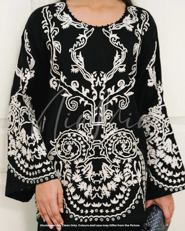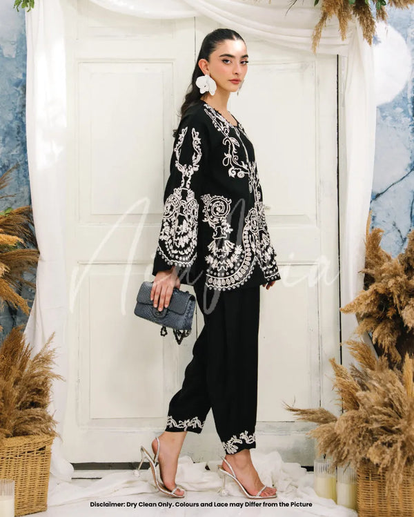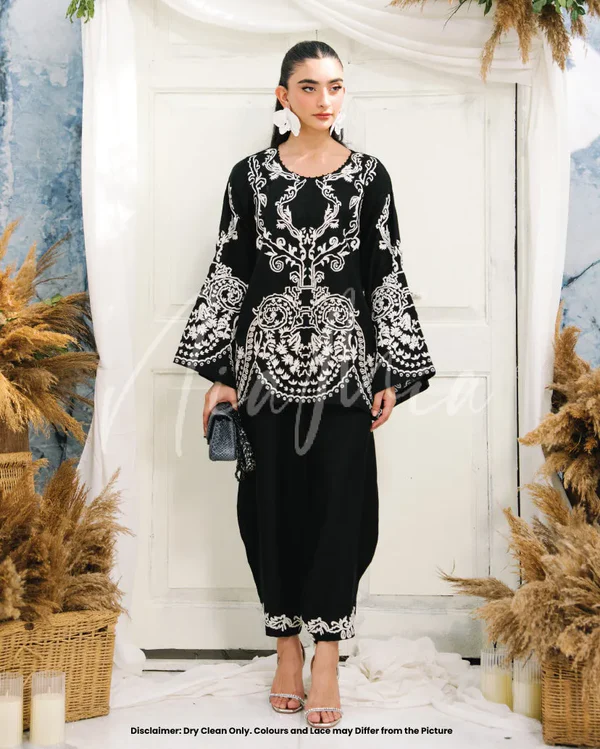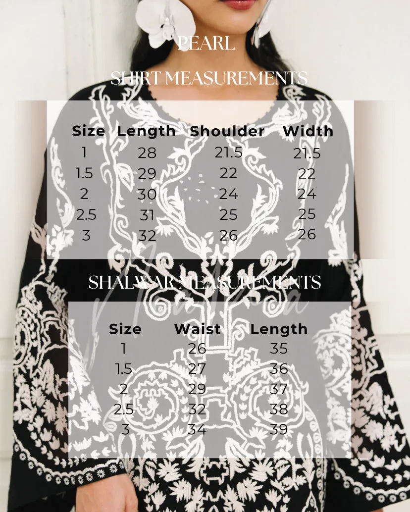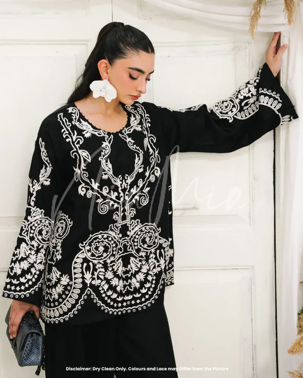 Pearl mixes classic black and white; featuring an embroidered shirt with intricate detailing that subtly elevates the overall look. Paired with a balloon shalwar, the silhouette feels relaxed yet intentional, perfect for winter days that call for comfort with elegance.