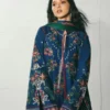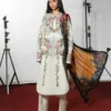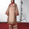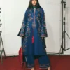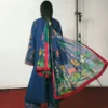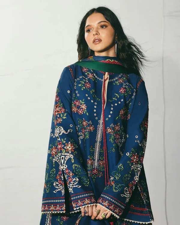 A refined blue long shirt, detailed with multicolor boring embroidery, is complemented by matching bell sleeves that add subtle movement and grace. It is paired with a blue dyed culotte finished with a delicately boring-embroidered border, while a digital printed silk dupatta completes the look with an elegant, contemporary touch.