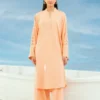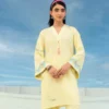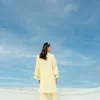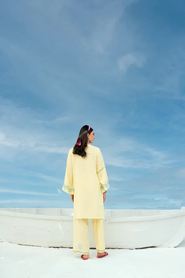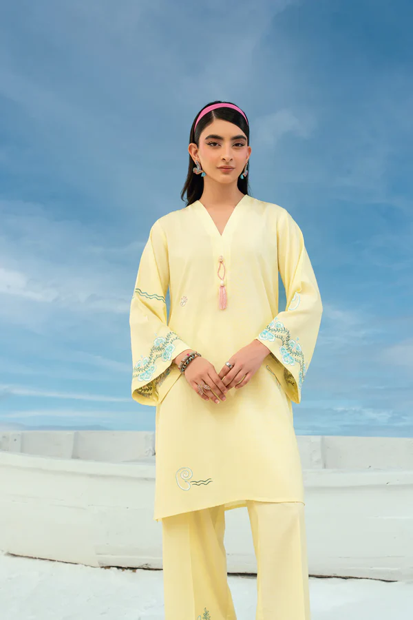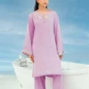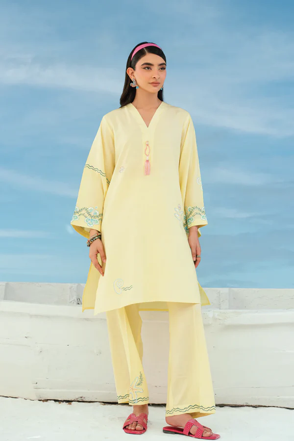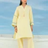 This outfit features a short shirt paired with straight culottes. The neckline features hand made tassels while the rest of the ensemble is adorned with intricate embroidery detailing.