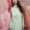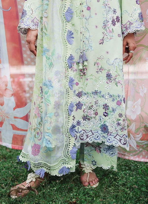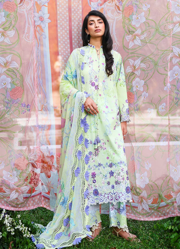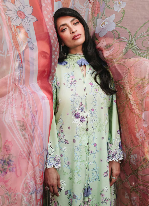 Pistara is a light green unstitched 3-piece suit crafted in printed cotton, featuring delicate floral motifs in soft lilac, lavender, and pastel tones that create a fresh, airy appeal. The shirt is detailed with an embroidered neckline, front, back, and sleeves, finished with refined border accents. The printed trouser complements the look, while the digital printed chiffon dupatta adds a light, flowing drape with graceful movement.