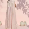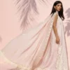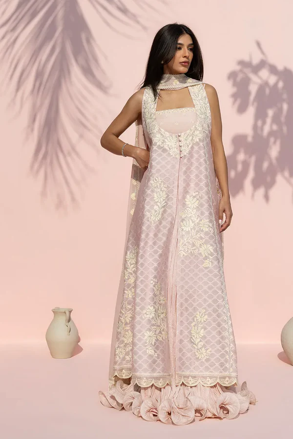 A sophisticated blush ensemble features a sleeveless, front open shirt crafted in cotton net, intricately adorned with ivory floral aari embroidery and finished with a delicate scalloped hem. It is layered over a matching embroidered khaddi silk peshwas with a statement crushed khaddi silk skirt detailed with ruffled hems. A sheer organza dupatta with ivory aari work completes this timeless silhouette.