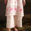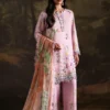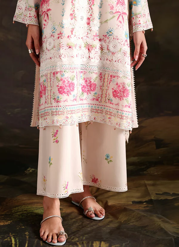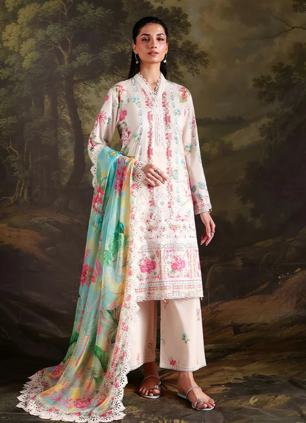 Rafae is an ivory unstitched 3-piece suit crafted in printed cotton, featuring delicate floral motifs in soft pink and pastel tones that create a graceful, timeless appeal. The shirt is detailed with an embroidered neckline, front, back, and sleeves, finished with refined border accents that enhance its elegance. The printed trouser complements the look, while the digital printed chiffon dupatta adds a light, airy flow with a soft, fluid drape.