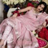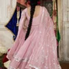 A light rose pink pishwas with delicate pani inserts, finished with lace, lappa and banarsi chindheri silk borders, paired with a matching chindheri silk churridar. The look is elevated with an intricately embroidered floral sequins panelled dupatta, adorned with insert lace details, tassels, and banarsi chindheri silk trims on all four sides.