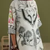 The dupatta is printed in black and white with paisley motifs and finished with a black border. The shirt features black and white art nouveau inspired prints. The trouser is detailed in black and white with a black border.