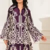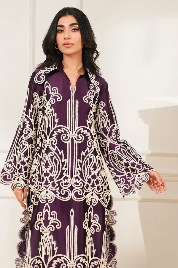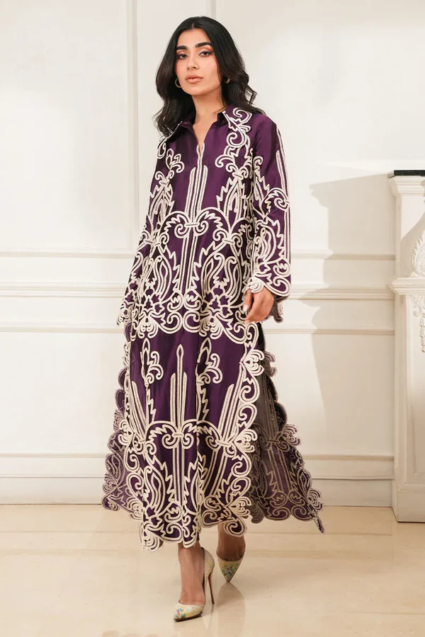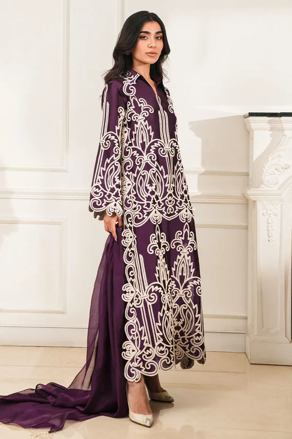 Silk shirt featuring all-over aari appliqué cutwork, paired with straight pants and a light chiffon dupatta finished with pearl tassels along the sides