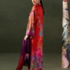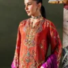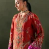 A majestic deep rust set featuring a long shirt with a graceful flared cut, richly adorned with sequins and bead work in floral, paisley, and peacock motifs. The neckline and front of the shirt are heavily embellished, while the sleeves are beautifully worked with accents of fuchsia and gold. Styled with a two-toned crushed dupatta and tailored trousers, detailed at the hem, this ensemble perfectly merges traditional artistry with modern sophistication.
