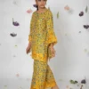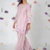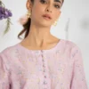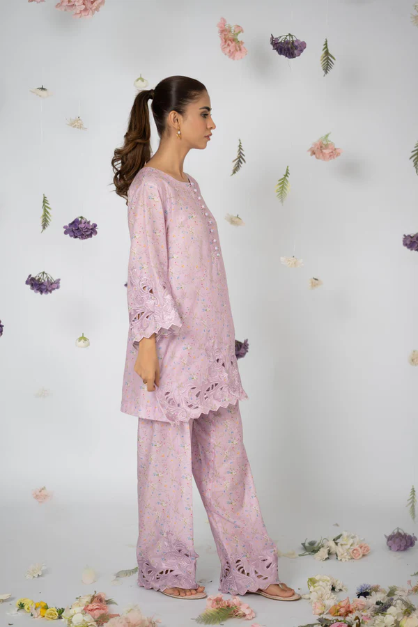 A coordinated pure lawn printed set adorned with refined cutwork embroidery at the sleeve edges, shirt hemline, and shalwar hems—bringing subtle elegance to everyday wear.