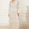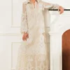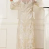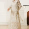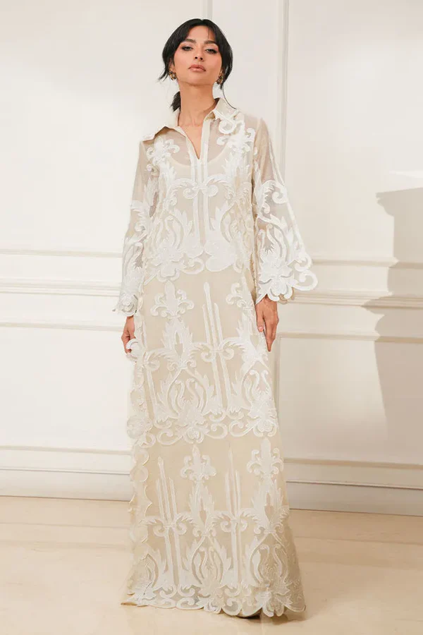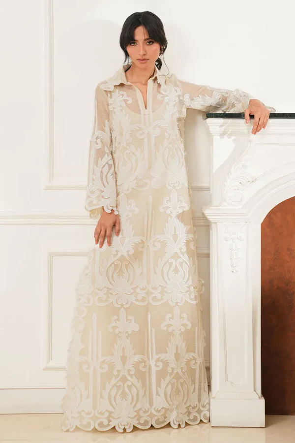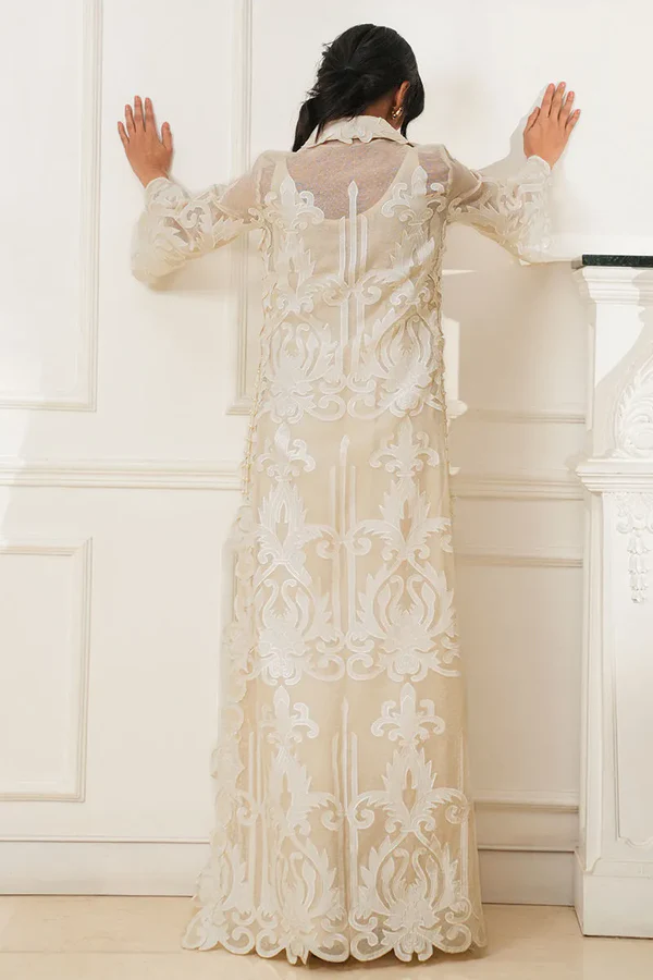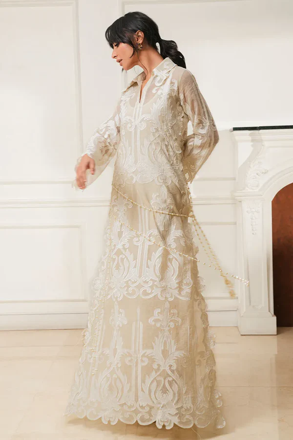 Cotton net shirt featuring all-over appliqué thread cutwork, finished with handmade pearl tassels along the sides. Paired with cotton silk pants for effortless elegance.