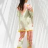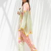 A crepe co-ord set exudes playful charm with its relaxed kurta, adorned in delicate pastel hues of tea green and blush chequered pattern, artfully accented by elephants, floral vines, fruits and vibrant hot pink hearts and pomegranates. Paired with perfectly tailored culottes featuring a whimsical chequered print.