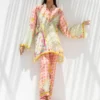 A crepe co-ord set exudes playful charm with its relaxed kurta, adorned in delicate pastel hues of tea green and blush chequered pattern, artfully accented by elephants, floral vines, fruits and vibrant hot pink hearts and pomegranates. Paired with perfectly tailored culottes featuring a whimsical chequered print.