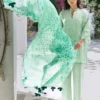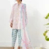 Cool and composed in mood, a soft powder blue jacquard lawn shirt is enriched with refined botanical embroidery, accented by playful pomegranate motifs in deeper tones across the surface. Delicate geometric embroidery defines the neckline with subtle precision. A statement medium silk dupatta in layered shades of powder blue and deep navy introduces bold geometric forms interspersed with stylised pomegranate elements, framed by a contrasting border for graphic impact. The look is completed with matching jacquard cotton culottes, finished with an embroidered hem.