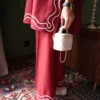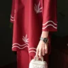 A deep maroon two-piece set featuring a straight kurta with white contrast embroidery in abstract and floral motifs on the front, sleeves, and hem. The kurta is paired with wide-leg trousers, detailed with matching embroidered borders, creating a striking yet elegant look.