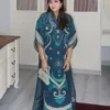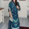 A jewelled tone silhouette, ‘Rise’ kaftaan cut from lustrous teal Khaadi corduroy is an ode to eclectic luxury. Vivid artisanal embroidery unfolds across the surface with bold florals in tonal shades of turquoise intertwined with geometric emblems, creating a tapestry of modern folk romance. Delicate organza and self embroidery details accent the neckline. Statement sleeves with curated geometric line embroidery complete the outfit with distinctive flair.