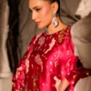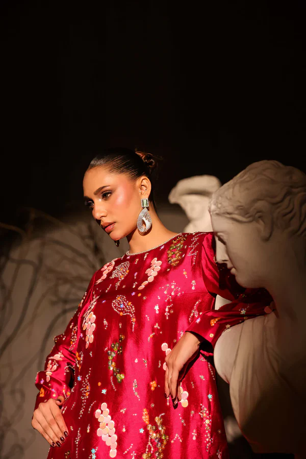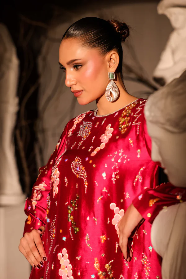 Pure sheesha silk short shirt with super intricate embellishments all over front and sleeves. Coin sequins, sequins, beads, crystals, rhinestones all over. Paired with a sheesha silk side draped a line skirt.