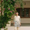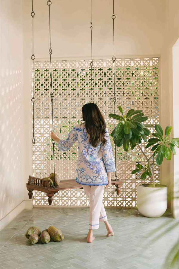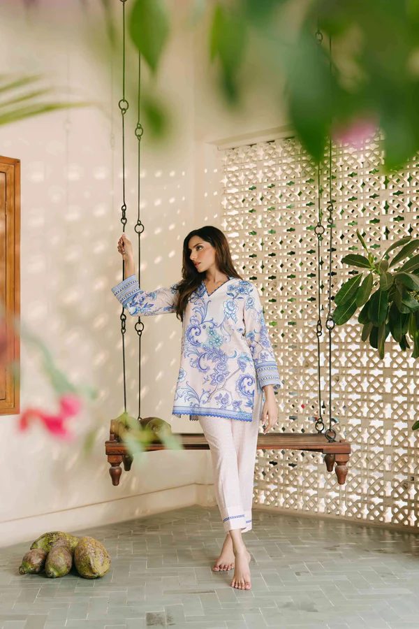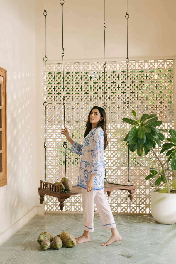 A breezy ensemble adorned with intricate blue botanical prints for a fresh, timeless appeal. The relaxed silhouette and soft detailing create an effortlessly chic, serene look.