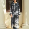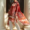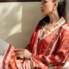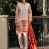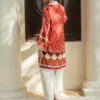 Immerse yourself in luxury with an ensemble featuring a radiant carmine and champagne toned khaddi silk shirt printed with floral artistry and a neckline embroidered with resham and mirror work. A cascading medium silk dupatta with an artisanal print in deeper shades of carmine emanates understated elegance! Complete the look with ivory tapered pants!