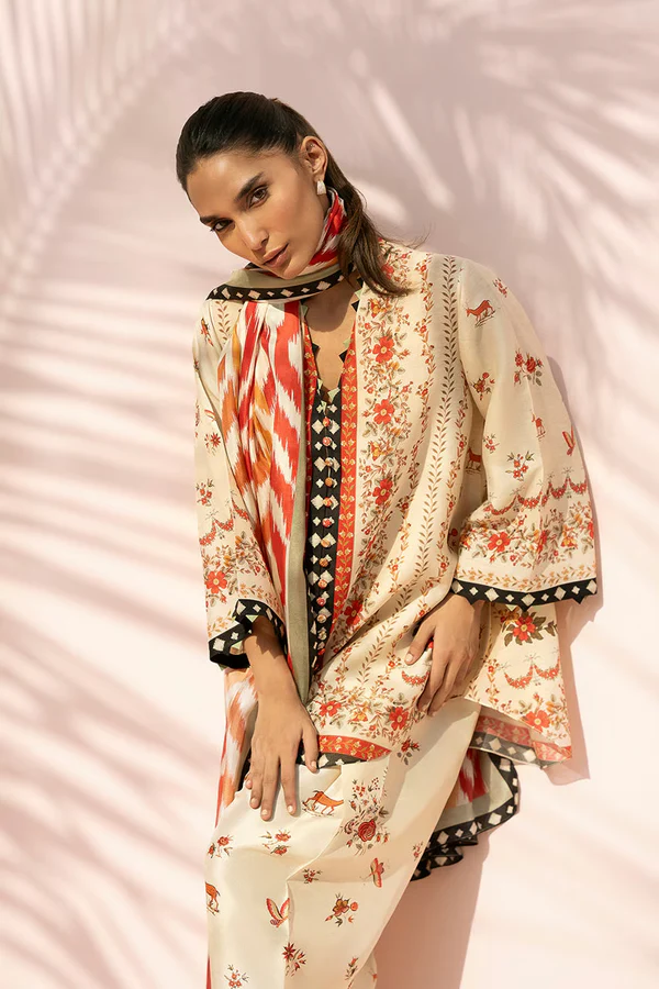 A relaxed co ord set in a warm cream hue is brought to life with scenic and floral motifs in tones of coral, rust, and soft peach. The shirt features a boxy silhouette with wide sleeves, framed by geometric borders in black and crimson that define the neckline, placket, and cuffs, and is paired with a tapered shalwar detailed with coordinated borders and scattered whimsical motifs. A medium silk dupatta in a bold ikat inspired print, blending burnt tangerine, mustard, and cream, is finished with a contrasting border, adding movement while maintaining an effortless feel.
