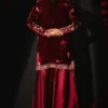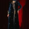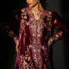 This striking magenta ensemble features a short front-open velvet jacket adorned with resham embroidery and intricate hand embellishments. The puffy sleeves add a touch of drama, while delicate floral and butterfly motifs bring a whimsical charm. Paired with flared sheesha silk pants, the look exudes contemporary elegance with a playful, feminine edge.
