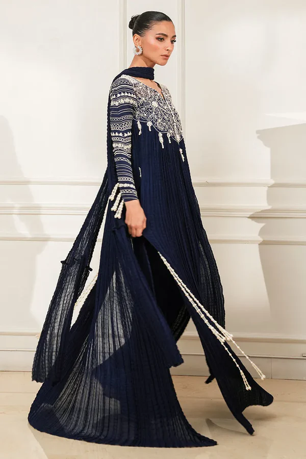 Blue crush shirt and dupatta adorned with delicate threadwork and handcrafted pearl detailing on the bodice. Finished with handmade pearl tassel hangings along the sides, paired with cotton silk pants for a graceful, fluid silhouette.