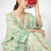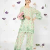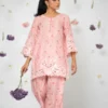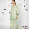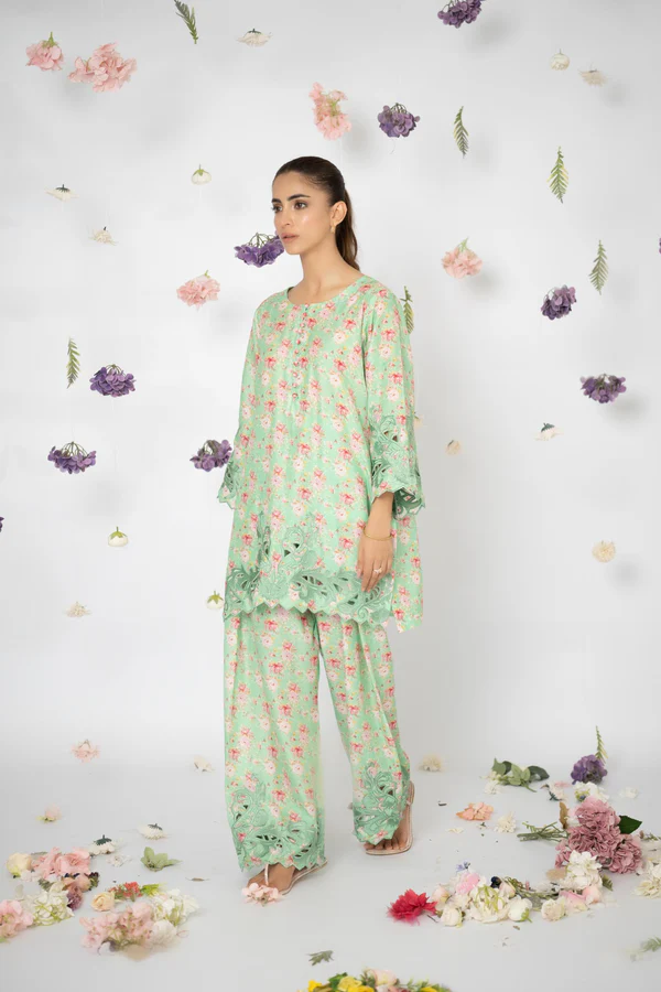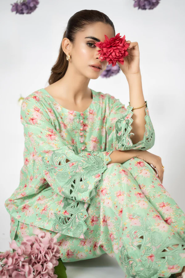 A coordinated pure lawn printed set adorned with refined cutwork embroidery at the sleeve edges, shirt hemline, and shalwar hems—bringing subtle elegance to everyday wear.