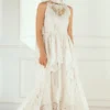 The ensemble features an ivory long shirt adorned with intricate embroidery throughout, enhanced by double-layered thread borders on the sides and daman with delicate scalloped detailing. Handmade thread tassels with pearl embellishments add a refined touch. It is paired with cotton silk palazzos featuring a complementing border, creating an effortlessly elegant look.