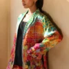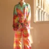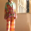 A vibrant crepe co-ord set infused with artisanal flair, this ensemble is rendered in citrus sorbet tones, layered with geometric grids and botanical accents. Paired with ebony hued crepe slip and relaxed culottes mirroring the vivid palette in a sunlit plaid, striking a harmonious balance.