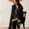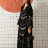- Black front-open jacquard kurta with boxy sleeves, V-neckline, and a mix of printed and jacquard fabrics. White linear floral embroidery, sleeve panel prints, and tassel-adorned neckline with lace details.