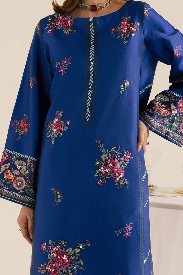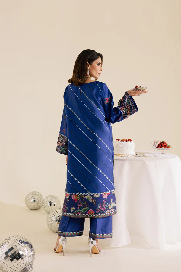 Printed silk shirt featuring embellished detailed motifs for a hint of sparkle, paired with matching printed silk straight pants for a chic and coordinated look.
