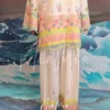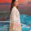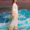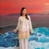A two-piece printed set on a fresh white base, brought to life with soft blue, green, and pink motifs. The straight silhouette features cutwork embroidery along the shirt hem and sleeves, with matching cutwork accents on the shalwar hem for a perfectly coordinated finish. A breezy yet polished choice for warm days.