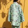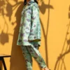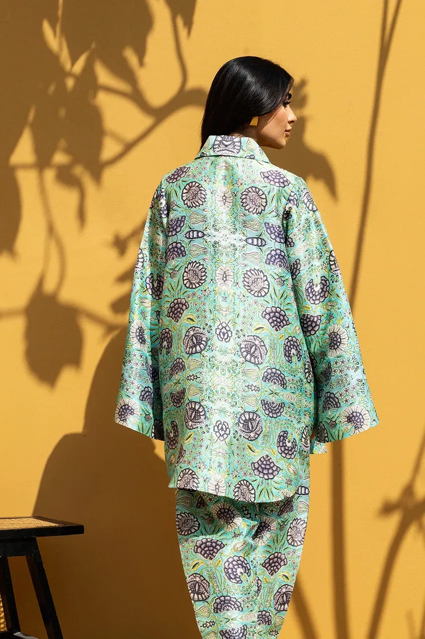 Rendered in a lustrous icy aqua, this contemporary pure rawsilk co ord set exudes relaxed sophistication. The oversized shirt is defined by architectural detailing, with a sharp collar, a striking lime contrast placket, and wide flared sleeves. Stylised floral motifs in deep violet add rhythmic interest to the fabric’s subtle sheen. Paired with a matching shalwar finished with a pleated hem, the look maintains its breezy, fluid silhouette.