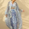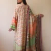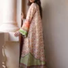 A classic silhouette is adorned with a sunlit apricot and verdant sage print, framed with intricate floral accents and scalloped crimson 3D detailing. The khaddi silk shirt is paired with pure rawsilk culottes and a cascading medium silk dupatta, exuding timeless charm.