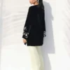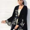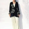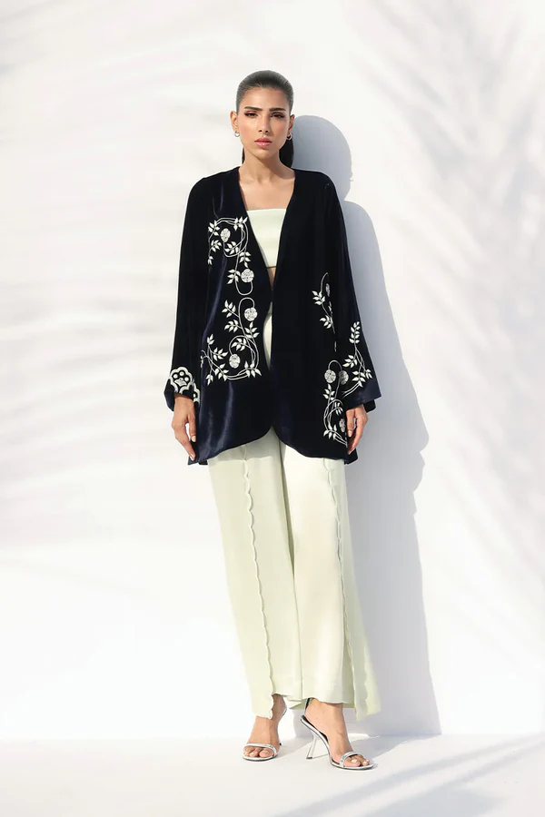 Bathed in midnight blue, this velvet jacket exudes refined grandeur through its fluid silhouette and exquisite threadwork with embellishment. Intricate botanical embroidery and flared sleeves bring a touch of quiet drama. Paired with an ivory tube top and scallop-detailed wide leg overlap pants in charmeuse, the look embodies modern sophistication.