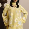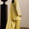 Shafaq is a radiant canary yellow Korean silk ensemble that celebrates festive vibrancy and refined craftsmanship. The kurta is fully embroidered in intricate gara patterns, showcasing meticulous artisanal detailing and a rich, textured aesthetic. Paired with an asymmetrically embroidered farshi shalwar, the silhouette flows gracefully while maintaining a contemporary elegance.