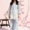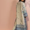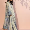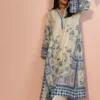 An elegant ivory toned ensemble featuring a relaxed A line khaddi silk kurta, adorned with intricate cobalt blue botanical embroidery and decorative floral motifs. The design is accented by a classic V neckline with a contrasting azure border and wide flared sleeves detailed with a mix of geometric and floral patterns. Paired with ivory hued pure rawsilk culottes finished with horizontal pleat detailing, the look is completed with a coordinating printed medium silk dupatta framed by a bold azure border for a breezy, sophisticated finish.