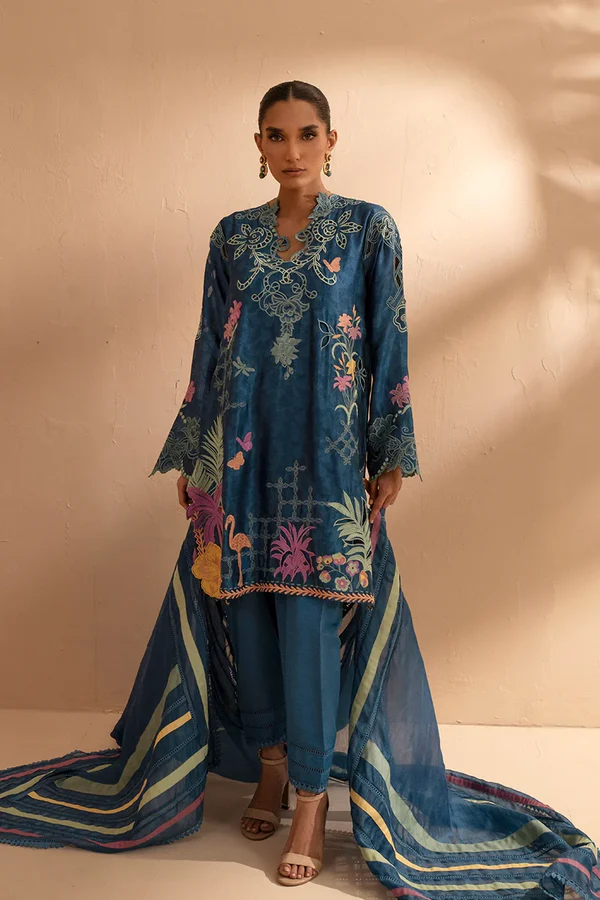 A vibrant teal hued ensemble in embossed sheesha silk is embroidered with playful appliques and resham details in vibrant pink, verdant green and yellow hues. The silhouette is elevated with scalloped hemline and plain khaadi silk dupatta, tailored to perfection! Pair it with a tapered shalwar for a glamourous look this festive season!