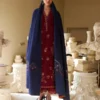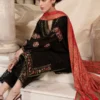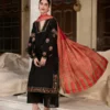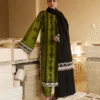 A black khaddar shirt, exquisitely embroidered with a vibrant, multi-colored pattern and delicate lace detailing. The side slits and neckline feature intricate cutwork embroidery in the base black color. It boasts elegant balloon sleeves, also adorned with embroidery. The outfit is paired with matching culottes, featuring complementary cutwork embroidery and lace details. To complete the ensemble, a contrasting printed shawl is included.