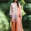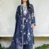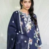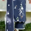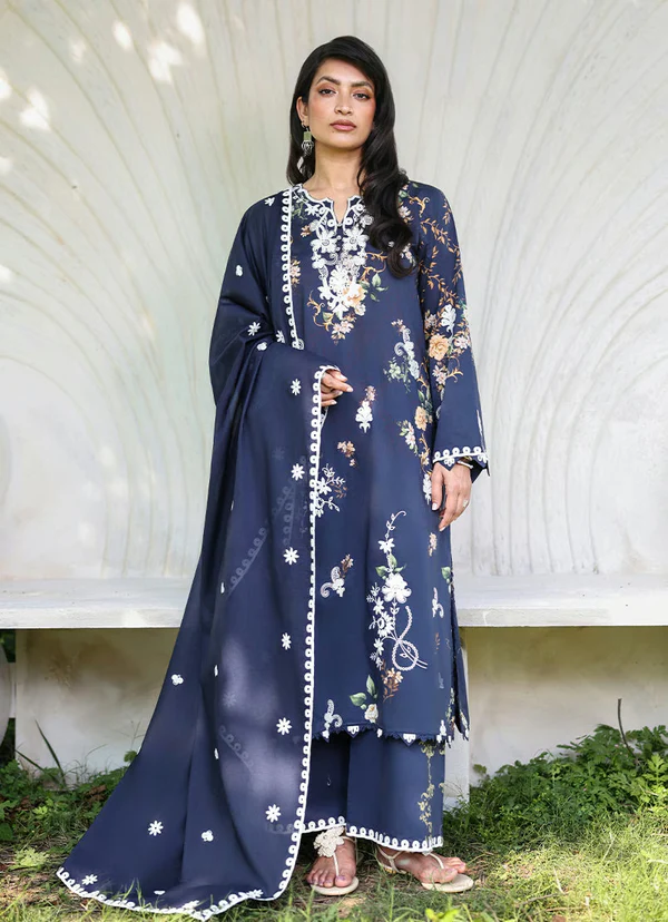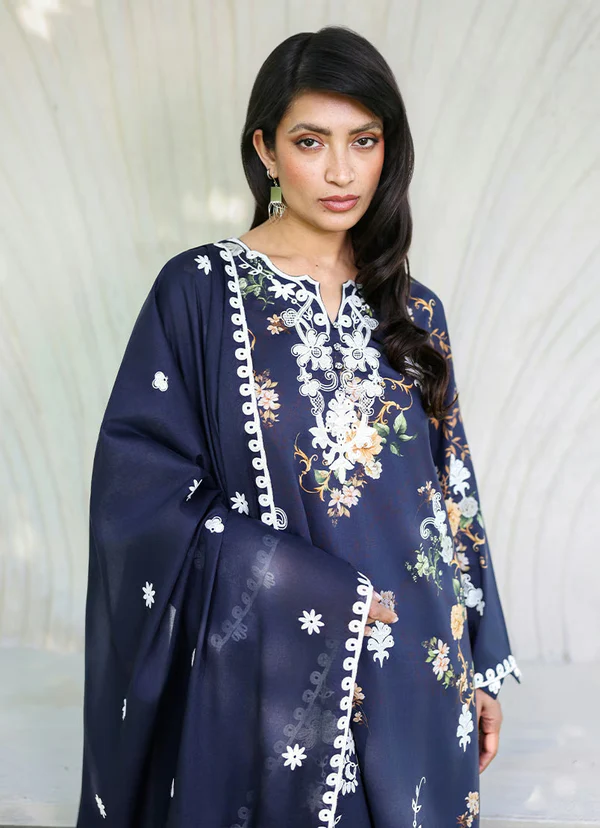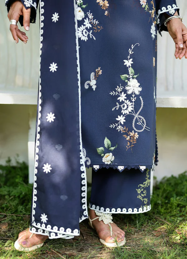 Skyelet is a deep blue unstitched 3-piece suit crafted in printed cotton, featuring delicate floral motifs in soft ivory and earthy tones. The shirt is enhanced with an intricately embroidered neckline and refined border detailing, while the printed trouser complements the look. Paired with a dyed voile dupatta finished with embroidered pallu borders, adding lightness and graceful movement.