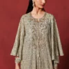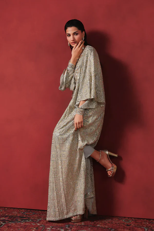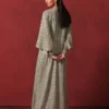 This gorgeous kaftan by AMMARA KHAN features a flowing silhouette detailed with sparkling crystal hand embellishments. The design includes fine geometric and floral embroidery throughout, with a neckline accented with signature beading. It is designed with statement sleeves and lightly adorned cuffs for a glam look. This ensemble comes with an inner slip and is paired with straight pants to provide a graceful, effortless fit for evening festivities.