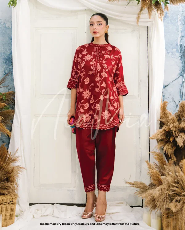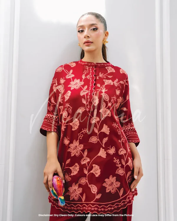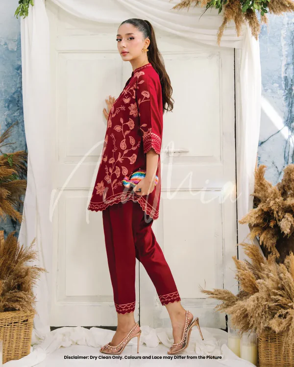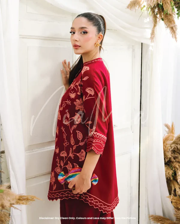 Sugar Swirl features an NM-cut embroidered shirt brought to life with intricate detailing that adds texture without overpowering the design. The embroidery is thoughtfully placed to enhance the flow of the silhouette, making it ideal for winter wear. Finished with a narrow shalwar, this two-piece set is both timeless and versatile.