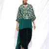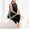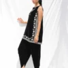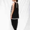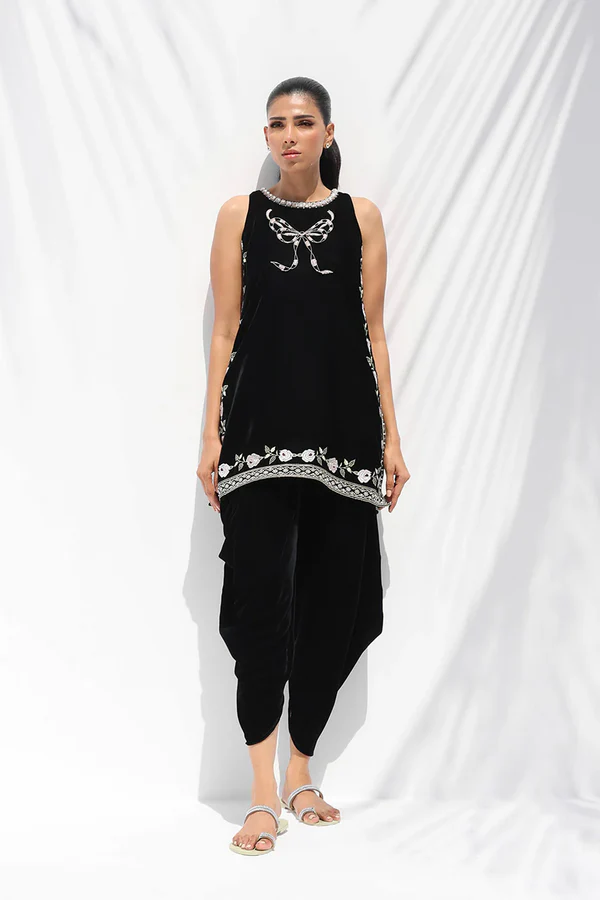 A vision of contemporary elegance, this ebony velvet shirt is tailored in a sleeveless A-line silhouette. Delicate embroidery adorns the neckline with a bow motif and traces the borders in soft floral vines. Paired with a velvet balloon shalwar that balances fluidity and structure, the look is finished with a pearl and diamante edged neckline, embodying modern glamour.