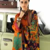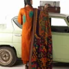The Suniva shawl captures the essence of a spirited journey and abstract elegance, perfectly aligning with the rich canvas of the Marina Twill suit. Dominated by a fiery terracotta orange, the ensemble is dramatically offset by brilliant teal and deep emerald accents, suggesting a clash of earth and ocean. Crafted from sustainable Lenzing Ecovero fabric, the shawl drapes beautifully, featuring abstract patterns and vibrant borders that speak to a global, eclectic aesthetics.