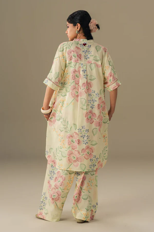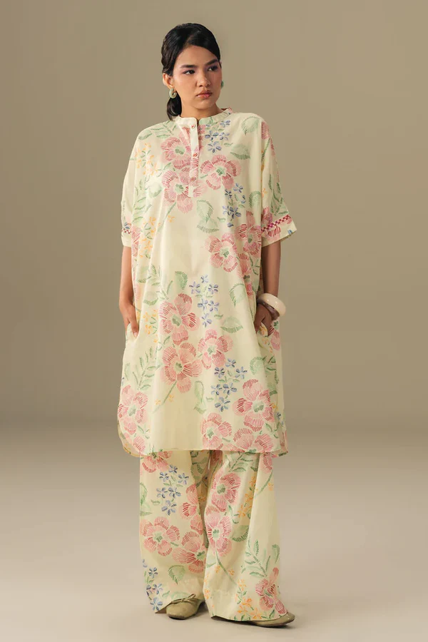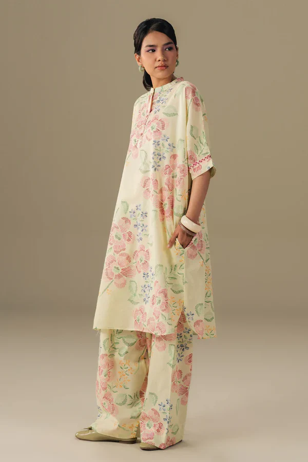 Bright with a refined edge. This floral printed shirt features a crisp collar and delicately embroidered sleeves, paired with a flowing farshi shalwar for an easy, put-together feel. Fresh, polished, and made to carry you through the day with effortless charm.