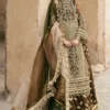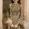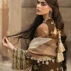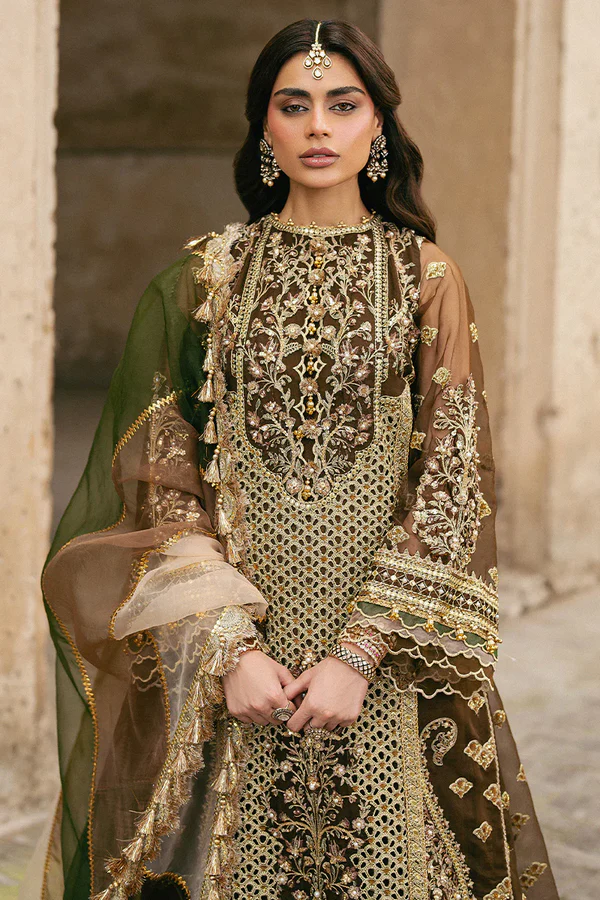 An opulent brown organza long shirt, richly adorned with intricate embroidery, laser-cut detailing, and a gleaming pani border, exudes timeless sophistication. It is paired with a flowing organza sharara and a beautifully printed dupatta, exquisitely finished with a gold badla scalloped edge for a regal and refined touch. A perfect statement of grace and grandeur.