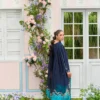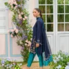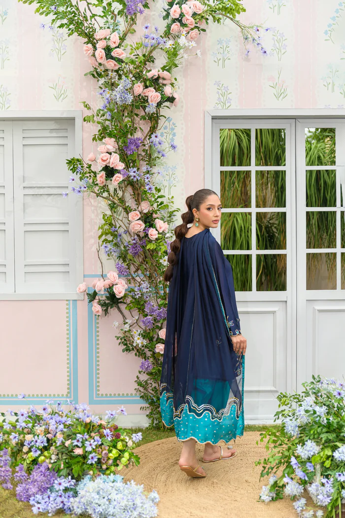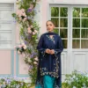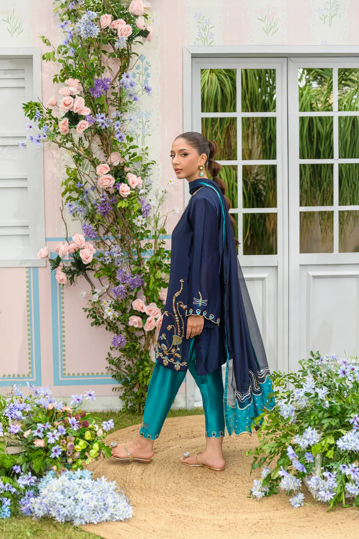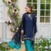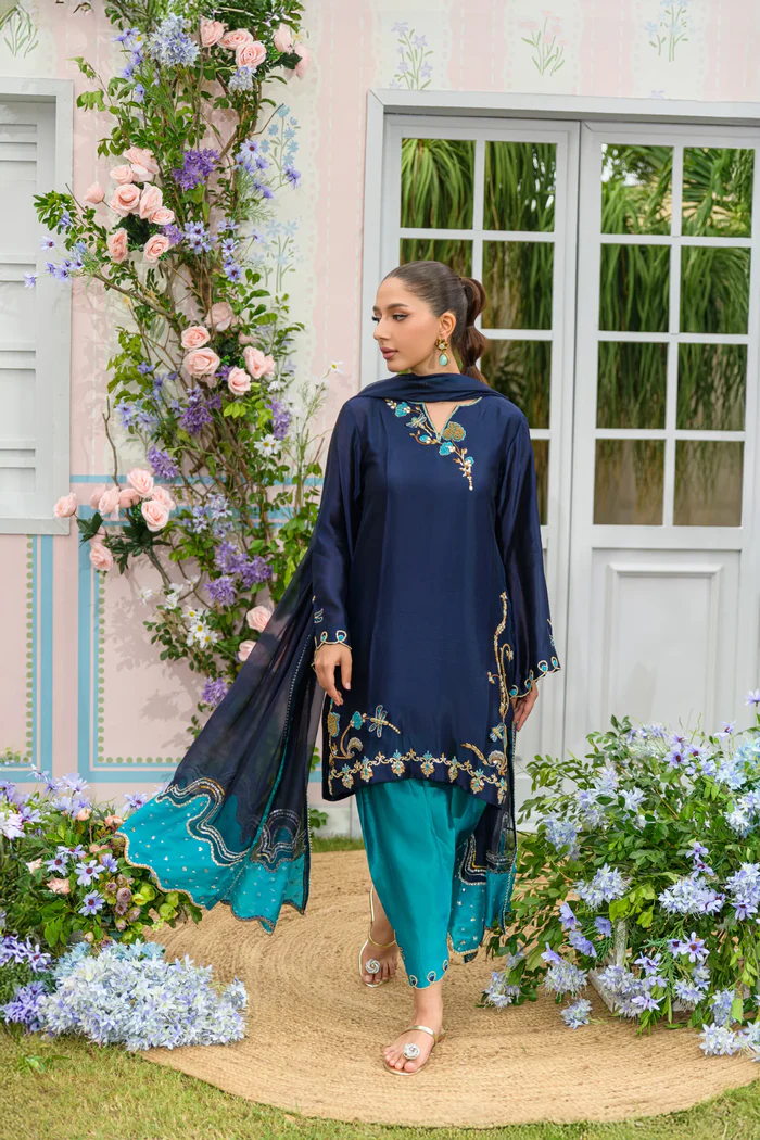In our favourite duo of navy blue and Aqua Ocean, this ensemble is a true showstopper. The shirt’s neckline and daman are richly adorned with intricate dabka, kora, and resham work in radiant gold-bronze tones. The dupatta is beautifully handworked with delicate cutwork detailing, sequin accents, and subtle shades of sea green — a perfect blend of elegance and festive flair.