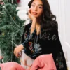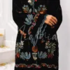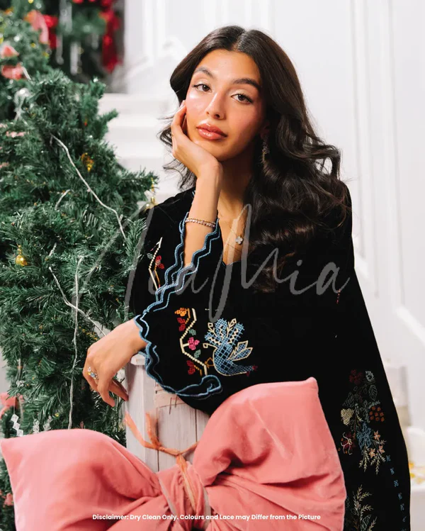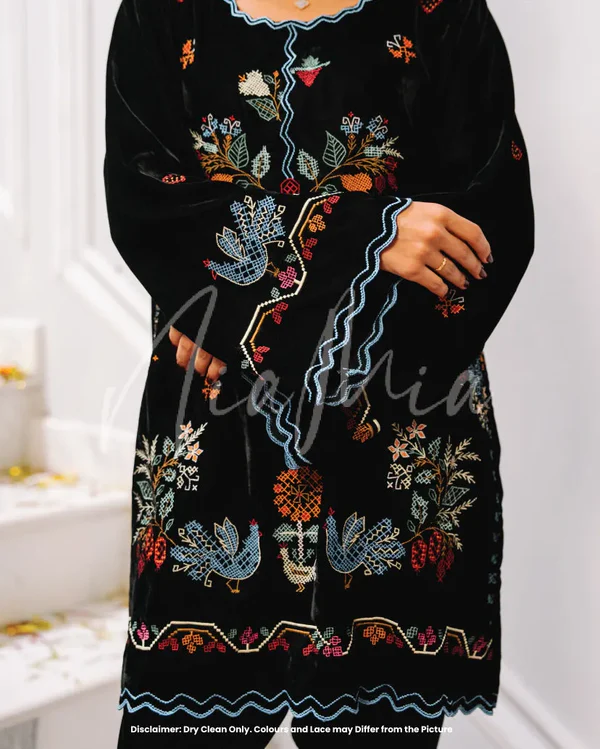 Thread is crafted in black velvet, featuring detailed multicolour crossstitch embroidery across the neckline, sleeves, and hem. The contrast between the plush base and intricate embroidery creates a refined winter silhouette that feels elevated yet wearable.